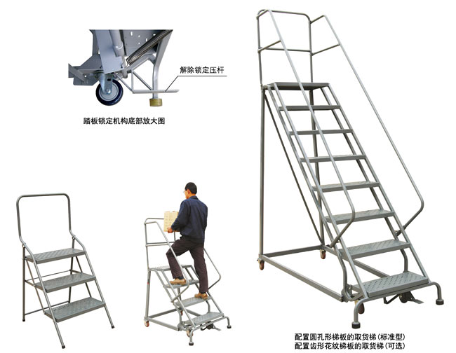 ● 配置踏板鎖定機構.踩壓底部踏板可自動固定梯子;踩壓底部踏板下方的解除鎖定壓桿,便可輕松移動取貨梯