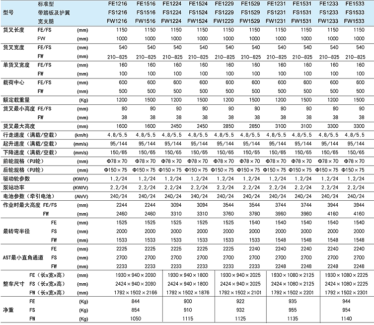 ◆ 充電器參數(shù):輸入220V/50Hz,輸出30A/24V ◆ FE、FS型可調(diào)貨叉可定制,可調(diào)范圍340-720mm ◆ Fn系列支腿外寬為1197-1502可調(diào) ◆ 最小直角通道AST是按照托盤尺寸(長×寬)1200mm×l000mm計(jì)算出來的 ◆ 對于貨叉可調(diào)型,貨叉必須對稱調(diào)節(jié),防止偏載失衡